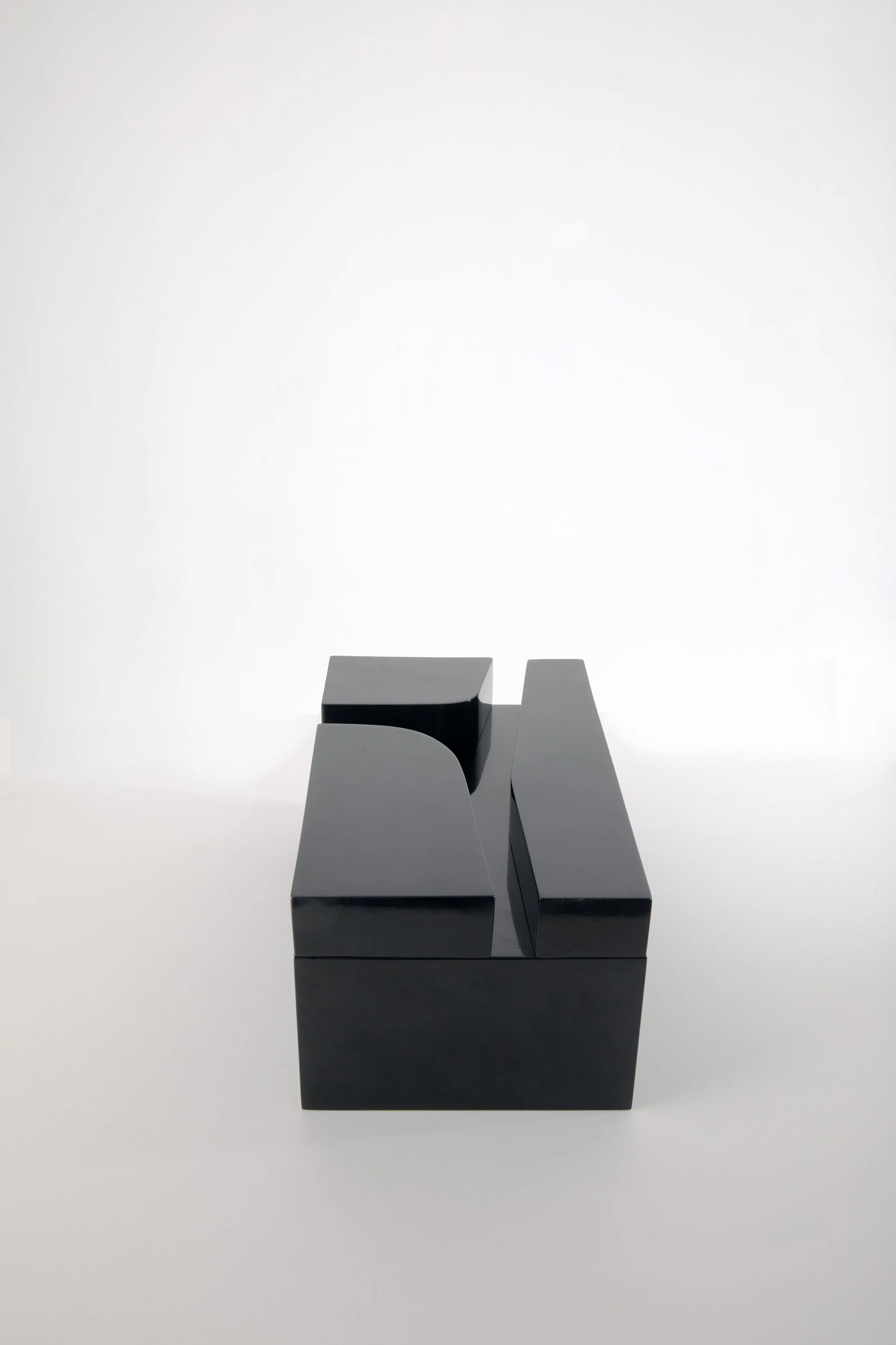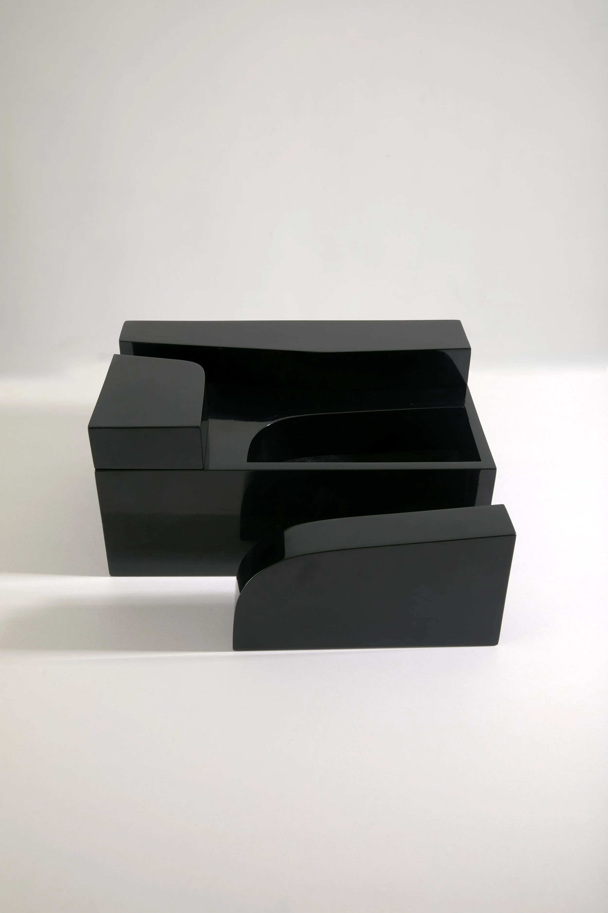 This catchall tray stands out through its play on perspective between the varying volumes in glossy black lacquer and the way light reflects off their surfaces.
